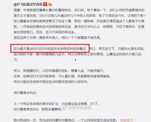 叶飞爆料的名单,无疑对市场产生了巨大的影响。首先,这些企业的股价出现了不同程度的下跌,投资者信心受到打击。其次,相关部门开始对涉及的企业进行调查,一些不法行为被揭露出来。